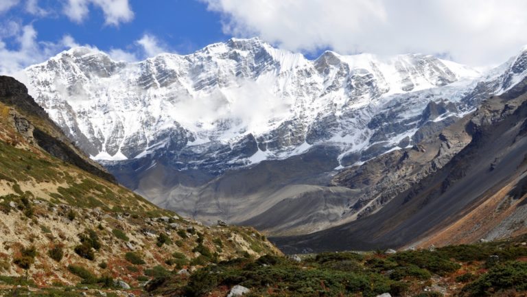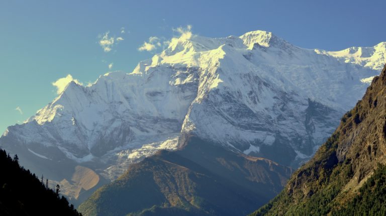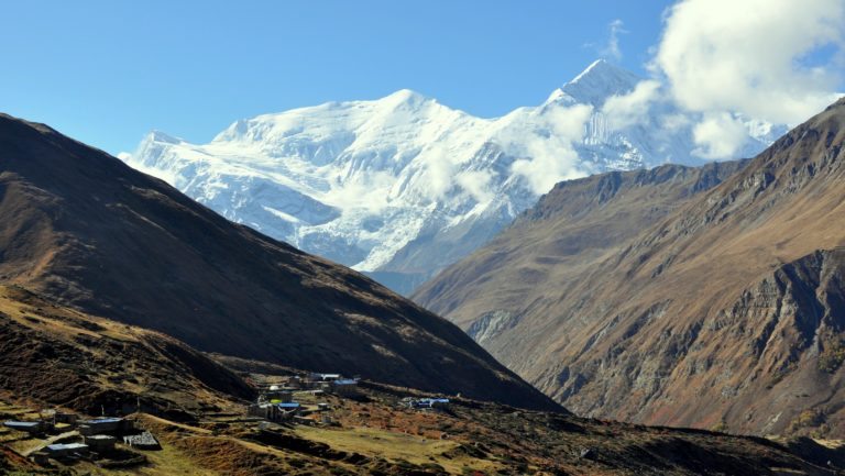 Et là, surgissant des nuages, un titan. Un sommet blanc étincelant, de roche et de neige, deux fois plus haut que toutes les montagnes qui m’entourent : le Manaslu (8163m).