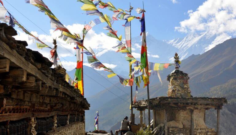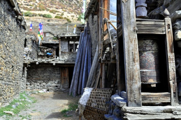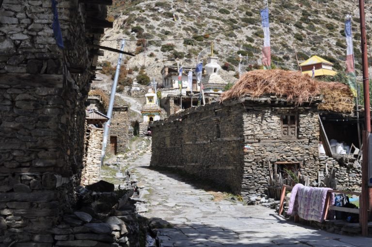L’influence de la religion hindoue, prédominante jusqu’à Chame, est maintenant totalement effacée. Les villages que nous avons traversés depuis ce matin sont typiquement tibétains. Si Lower Pisang semble plus « moderne », envahit par des lodges colorés, Upper Pisang a conservé une âme de village tibétain authentique.