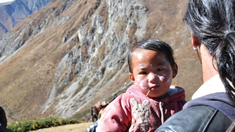 Sur chaque maison flotte le drapeau blanc tibétain. Les gens ont également un faciès plus râblé que dans la vallée, peut-être en conséquence de la rudesse du climat montagnard.