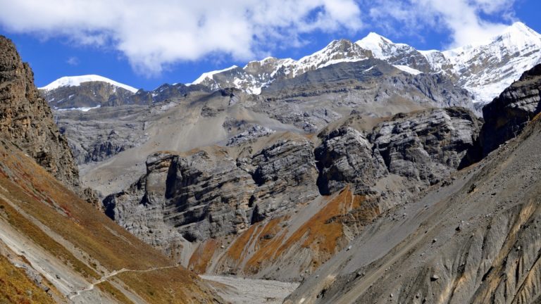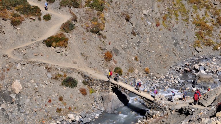 De Yak Kharka à Thorung Phedi l’ascension est faible, mais reste éprouvante à cause de l’altitude. Les cours d’eau à l’ombre sont gelés, la température commence sérieusement à baisser.