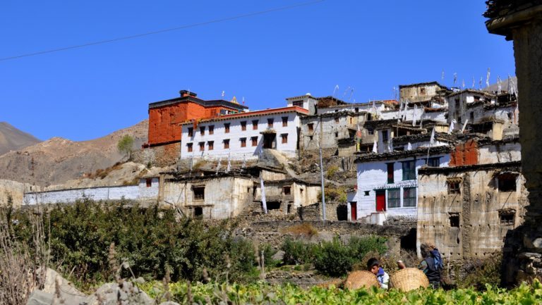 Moulins à prières décorés de bouddhas, manis et chortens marquent l’entrée du village. Bâties par d’épais murs de pierres, les maisons sont construites de manière identique pour résister au froid : au nord, aucune ouverture ni fenêtre n’est percée, au sud, elles s’ouvrent sur une large terrasse, sur laquelle est stocké le bois de chauffe.