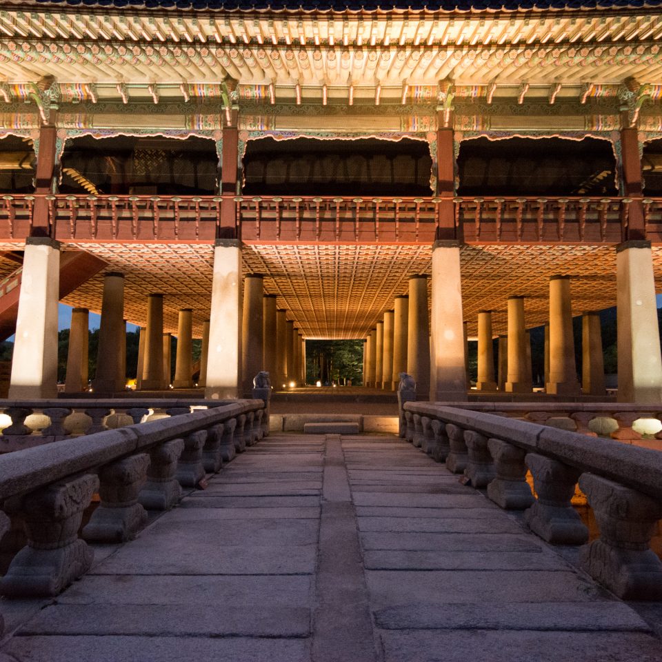 Bulguksa, « Temple des Terres du Bouddha » a depuis été très remanié et maintes fois reconstruit. Seules les pagodes en pierre, conçues pour abriter des reliques, sont d’origine.