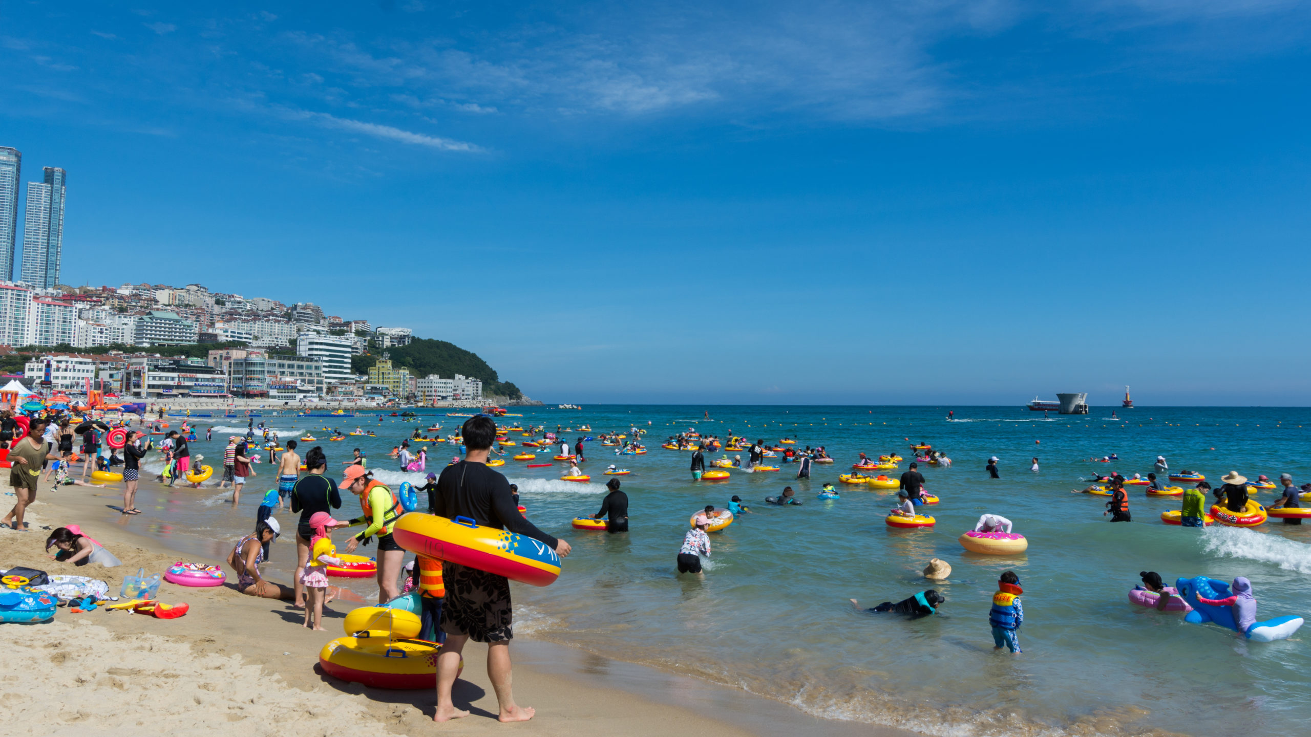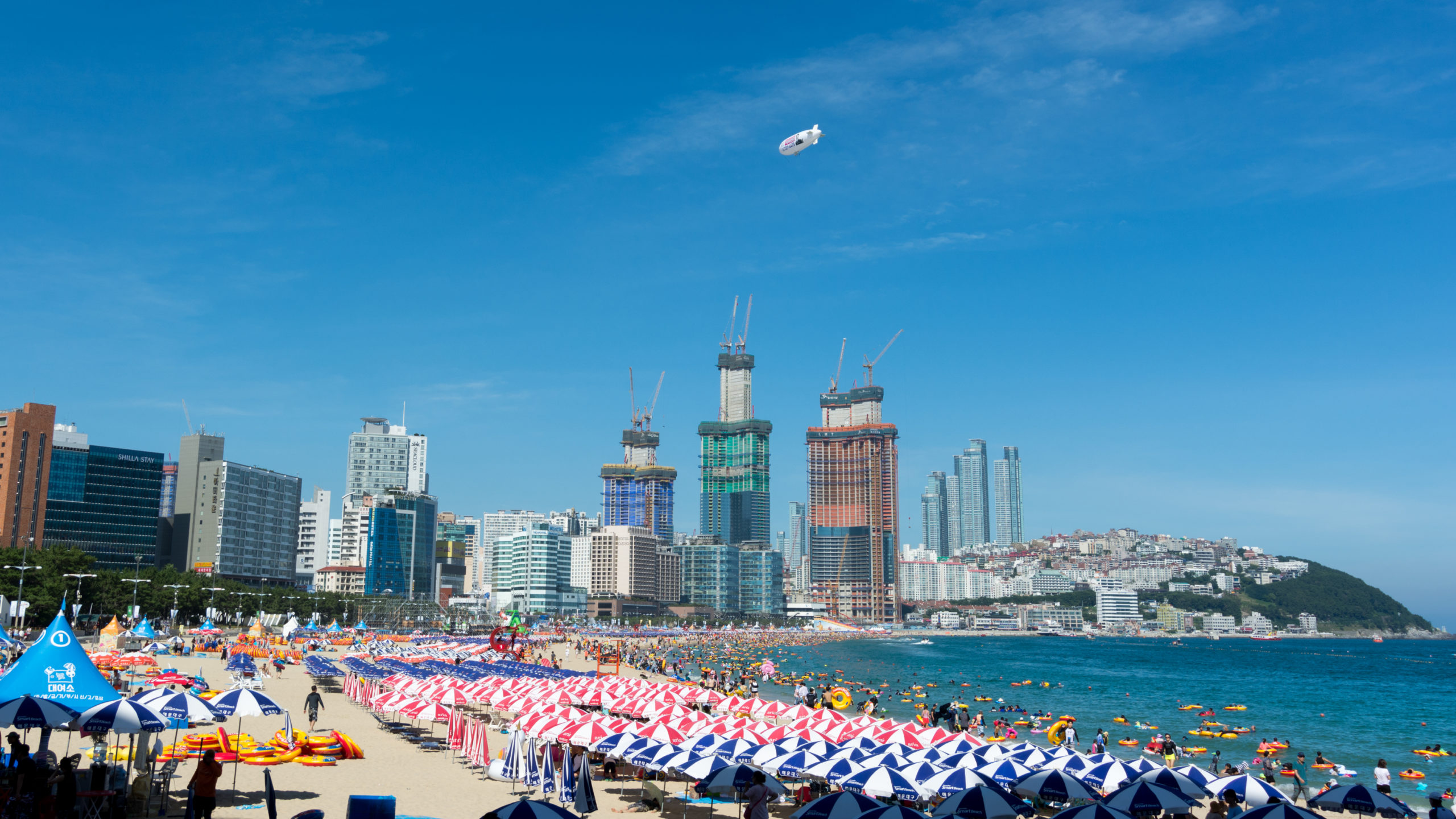 Il faut alors le voir pour le croire : des lignes de parasols jusqu’à la mer, des scènes musicales sponsorisées gargantuesques et dans l’eau couleur bouée, une pellicule irisée et opaque de crème solaire. Sur le boulevard du bord de mer, derrière la ligne de cafés et restos, hôtels luxueux et tours en construction, toujours plus chères et plus modernes. La Corée ne connaît pas la crise du logement.