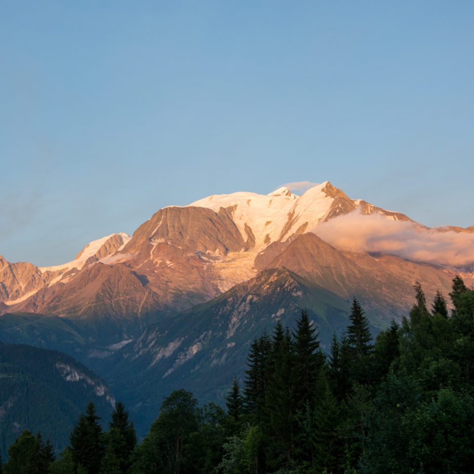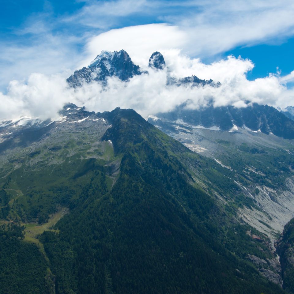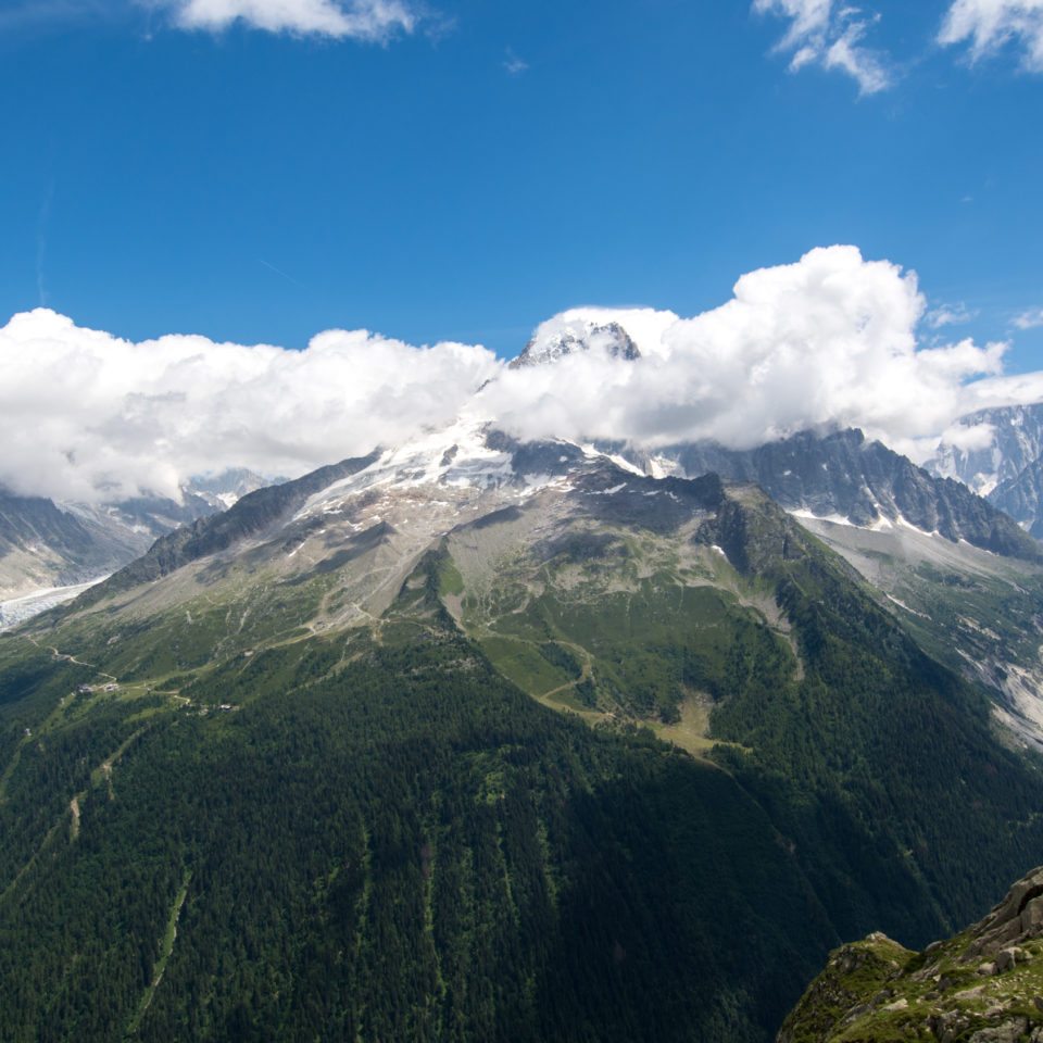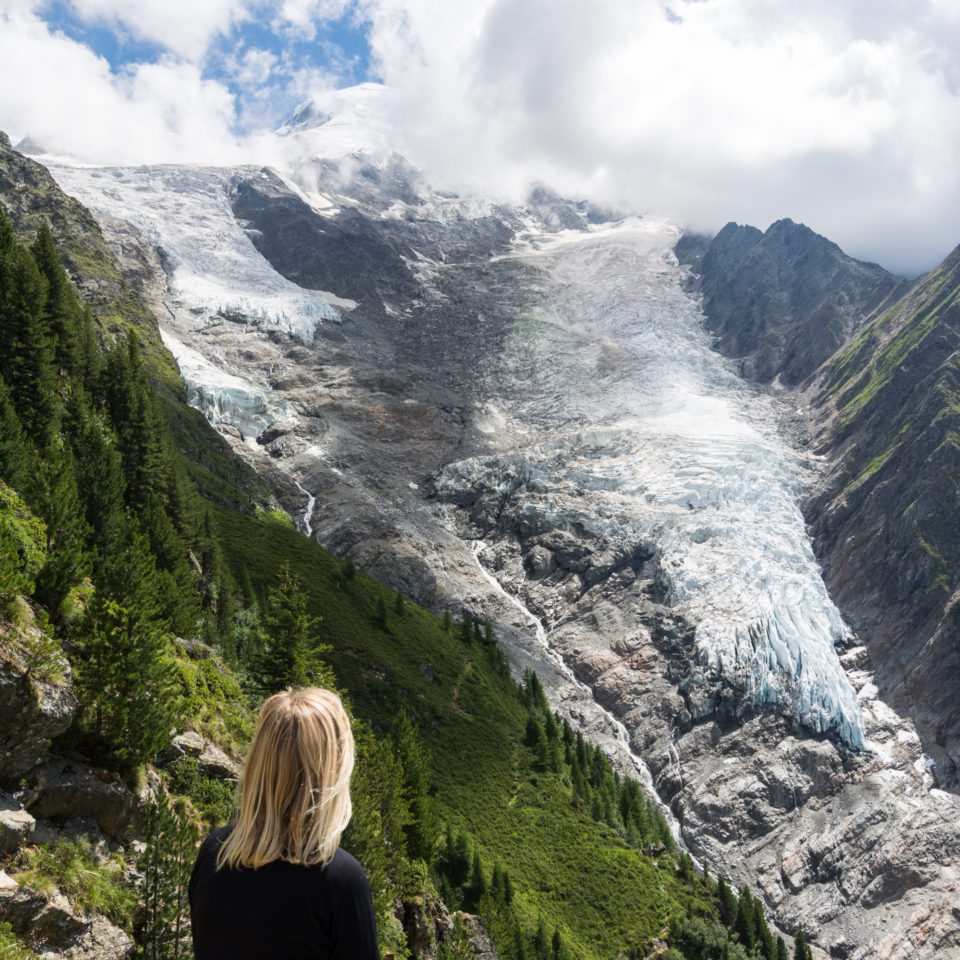 Et ça se comprend : devant nous, le massif du Mont-Blanc nous domine par ses sommets légendaires : l’Aiguille Verte (4122m), l’Aiguille du Midi (3842m) et bien sûr le Mont Blanc (4810m). Depuis les sommets, des langues de glace descendent des vallées rocheuses, et contrastent avec les forêts verdoyantes.
