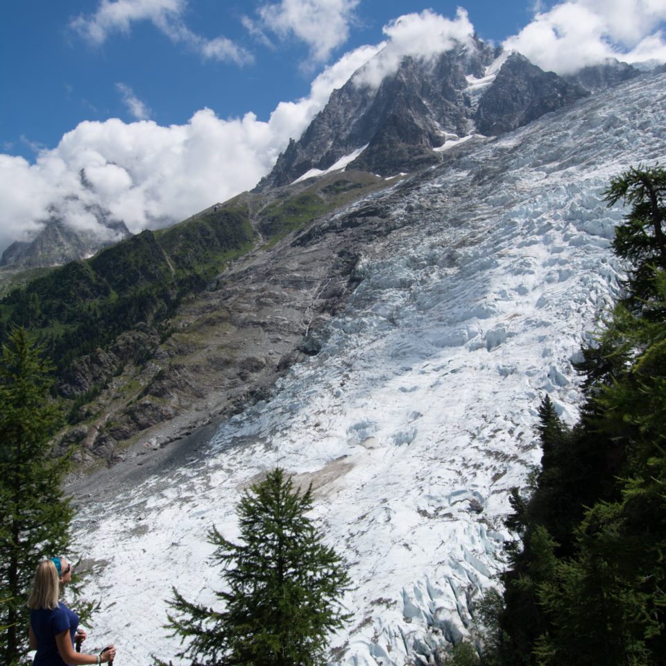 - Parcours : Le sentier grimpe régulièrement et tout de suite assez fort. On atteint le chalet du glacier des Bossons en 1h. Je conseille de vous arrêter plutôt au retour pour profiter de la vue incroyable sur le glacier des Bossons car le matin vous serez à contre-jour. Il faut ensuite compter 1h20 pour rejoindre le Chalet des pyramides. L’ascension est ensuite plus raide, jusqu’à ce que l’on surpasse les derniers arbres. La dernière partie est rocailleuse.