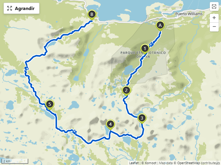 Le trek se boucle en 3 à 5 jours, mais les conditions climatiques extrêmes peuvent le rendre très compliqué. On vous conseille vivement de vous renseigner sur la météo à Puerto Williams et de n’envisager de partir que sur une fenêtre favorable.